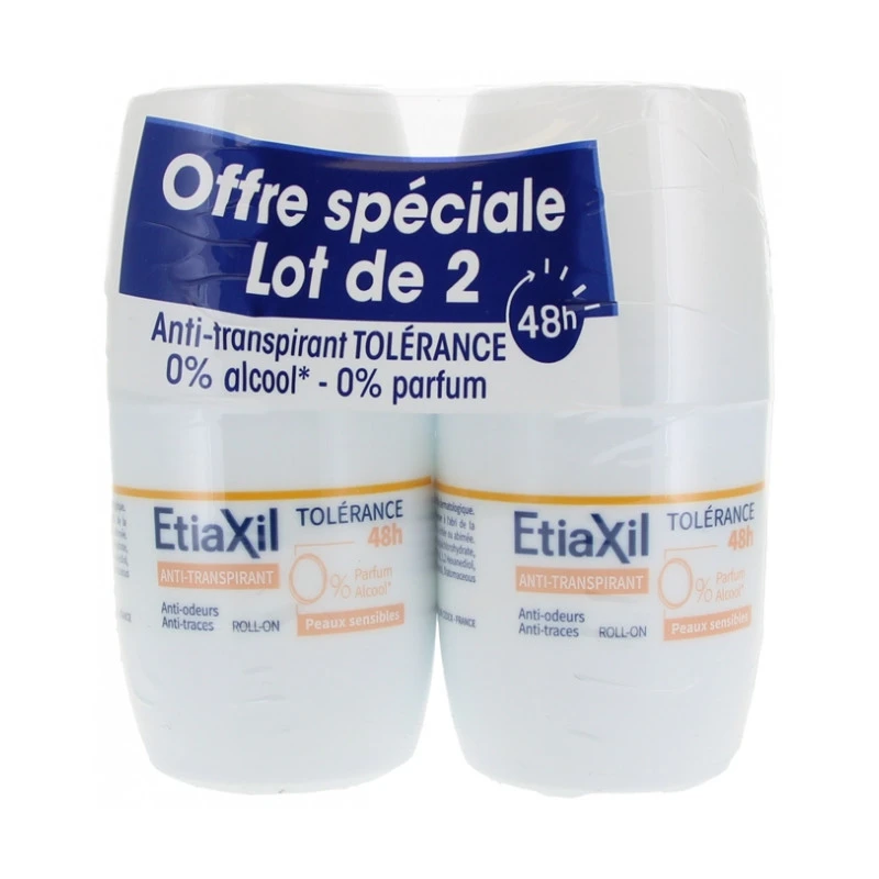 ANTI TRANSPIRANT TOLERANCE 48H Peau sensible LOT DE 2 Roll on de 50ML ETIAXIL est enrichi en agents apaisants, convient à tous les types de peaux, même les plus sensibles, tout en apportant une sensation de fraîcheur.