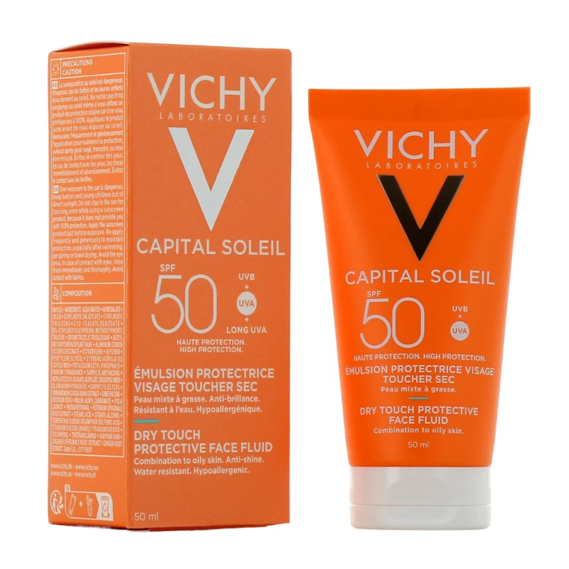 CAPITAL SOLEIL EMULSION PROTECTRICE VISAGE SPF50 50ML VICHY convient aux personnes ayant la peau sensible mixte à grasse.