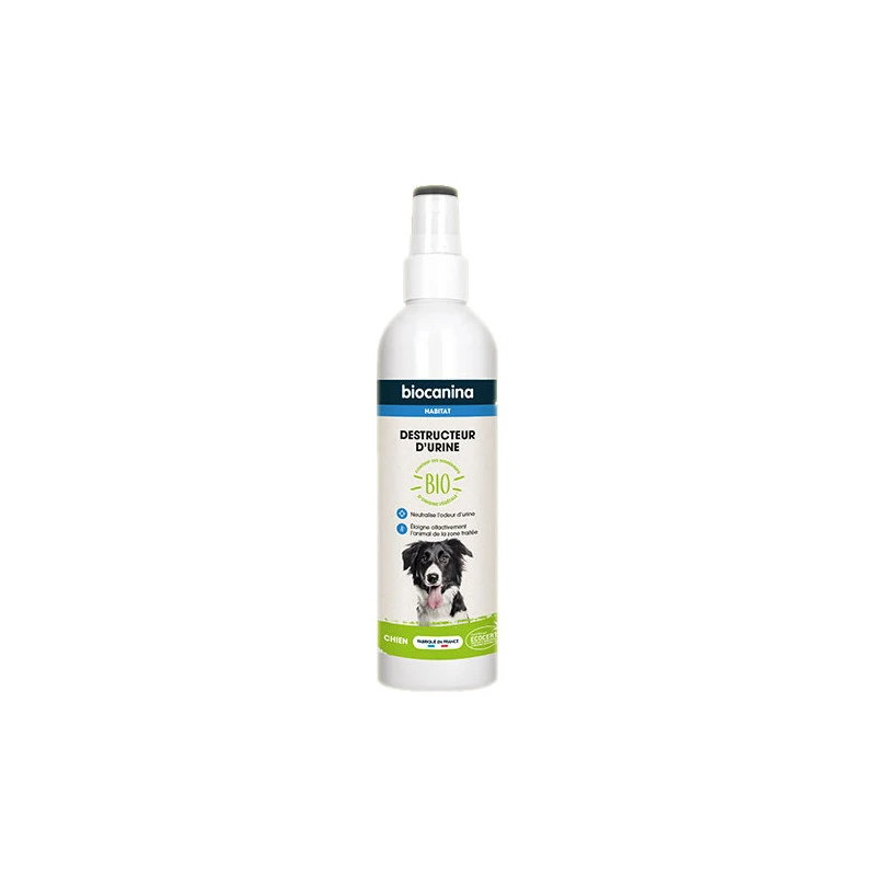 DESTRUCTEUR D’URINE BIO CHIEN 240ML BIOCANINA neutralise l’odeur d’urine, éloigne olfactivement l’animal de la zone traitée.