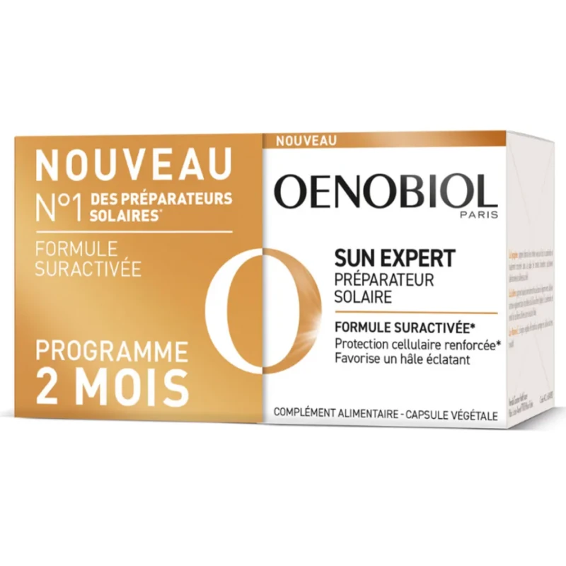 SUN EXPERT PREPARATEUR SOLAIRE LOT DE 2 X 30 CAPSULES OENOBIOL complément alimentaire solaire qui permet de protéger et renforcer les peaux avant l’exposition au soleil.