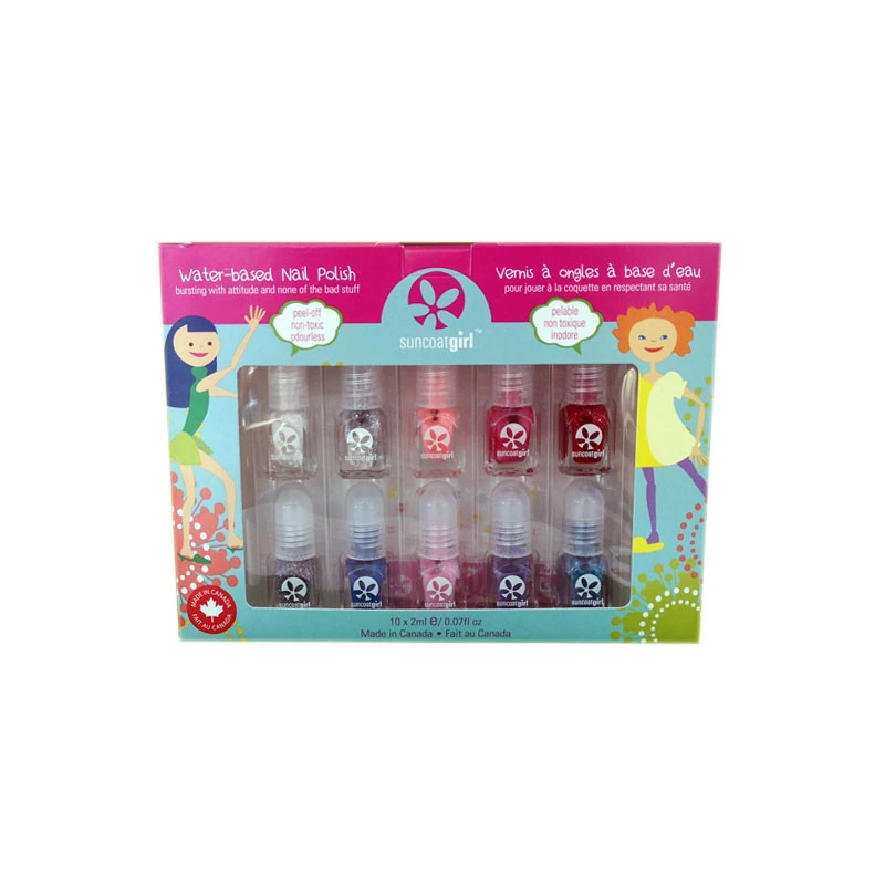 SUNCOAT MINI VERNIS ONGLES à base d’eau 6 X 2ML kit de 10 mini-vernis à base d’eau, de couleurs assorties, pour permettre aux petites filles de jouer les coquettes en respectant leur santé.