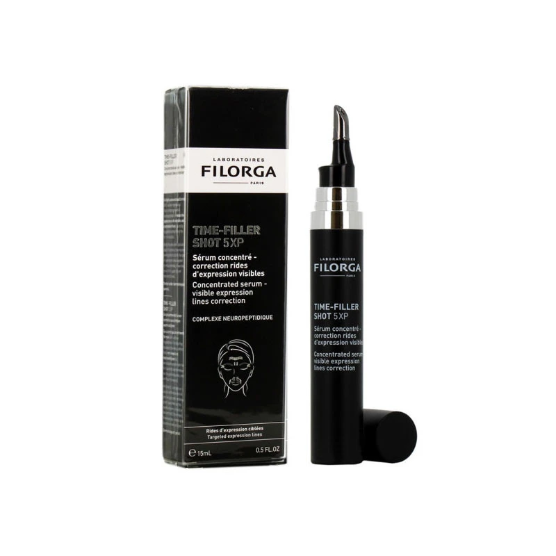 TIME FILLER SHOT 5XP SERUM CONCENTRÉ 15ML FILORGA : une formule hautement concentrée [60% d’actifs], inspirée des injections de botox, qui contient un complexe neuropeptidique qui recrée avec précision l’effet dermo-relaxant de la toxine botulique pour que la peau reste lisse.