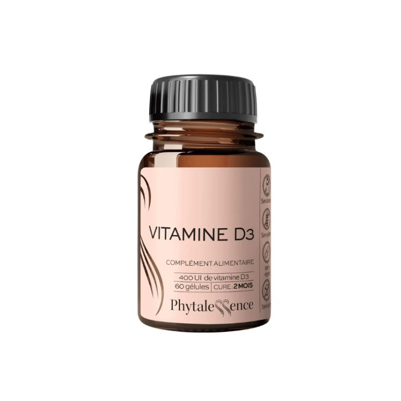 VITAMINE D3 60 GELULES PHYTALESSENCE contribue à une calcémie normale, au maintien d’une ossature, d’une dentition et d’une fonction musculaire normales.